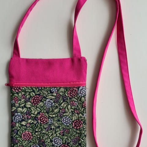 Kankaisessa laukussa on edessä pieni vetoketjullinen tasku. Läpässä on somat perhoskoristeet ja hapsut. Laukun mitat: korkeus 12 x 8,5 cm. Kankainen läppä antaa korkeussuunnassa lisää tilaa isommallekin kännykälle, mutta mikään kovin iso puhelin tähän ei toki mahdu. Olkahihnan / kantohihnan kokonaismitta 120 cm.