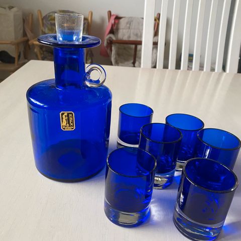 Kumelan lasin valmistamat pikku karahvit korkeilla sekä kumelan taidelasi pullo. Kaikki väriltään sinisiä. Kaikki ehjiä ei vikoja. Karahvin korkeus korkin kanssa 13 cm ja pullon korkeus 15.5 cm.