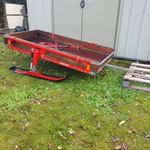 Mitat. Laatikko-osa pit. 264 cm, + vetoaisa 114 cm. Laatikon lev. 97 cm päältä. Kork. 33 cm. Pohjakiskot terästä, reunoilla 6 x 40 mm, keskellä 5 x 80 mm. Vasemmalla etureunassa murtumaa, avoreikä. Korjattavissa lasikuidulla. Sellaisenaan valmis kelkan perään, jämerä rakenne.