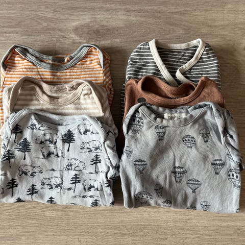 Kolme kappaletta bodyja, joista kaksi newbie ja yksi monia. Eläinaiheinen body hieman nyppyyntynyt ja muutenkin pienempää kokoa kuin muut. Lila röyhelökauluksella ja vaaleanpunaisessa röyhelöetumus.
