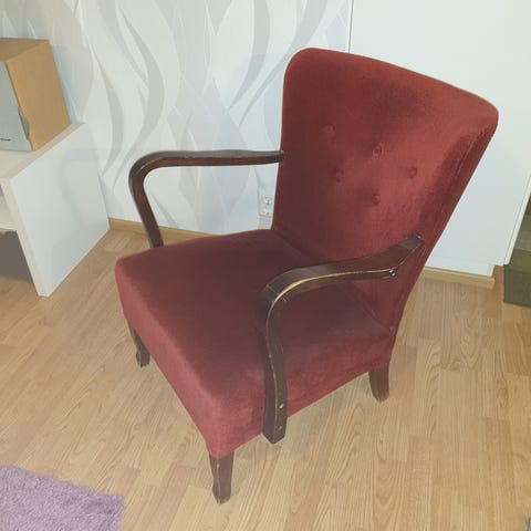 Runko ja jouset ehjät. Vaatii verhoilun. Tuotu suoraan vintiltä ja on myös sen näköinen.
