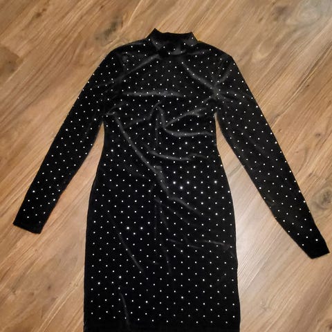 ilta- tai juhlapuku, väriltään musta, koko M. Mekko on suunniteltu naisille ja sopii erityisesti juhla- ja iltatilaisuuksiin. Malli on vartalonmyötäinen, lyhyt ja siinä on leveät olkaimet.
