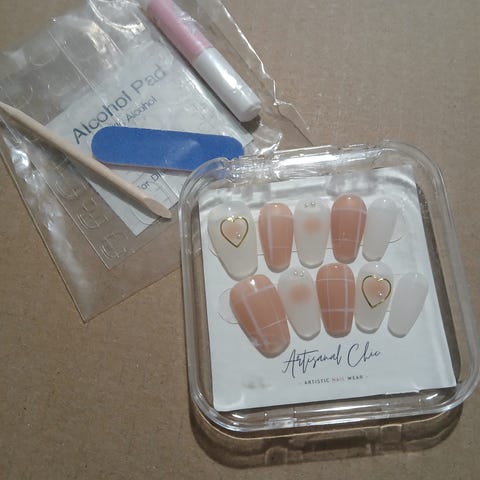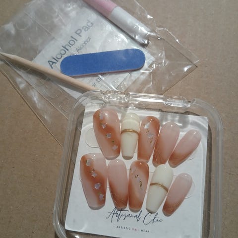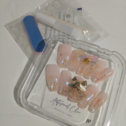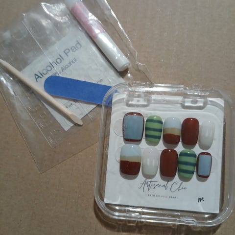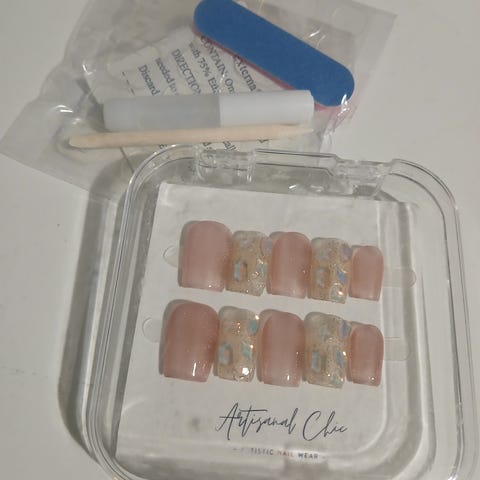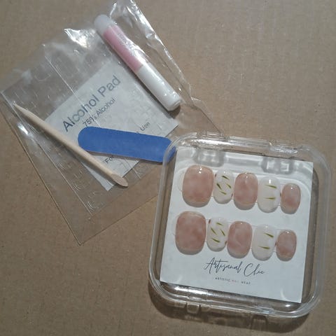 Myydään kuvan mukaiset uudelleen käytettävät press on tekokynnet. Setit käyttämättömiä Kynsien koko M. Mukana tulee myös liimaussetti, joka sisältää kynsiviilan, puisen tikun, liiman, alkoholipuhdistuslapun ja liimaustarrat.