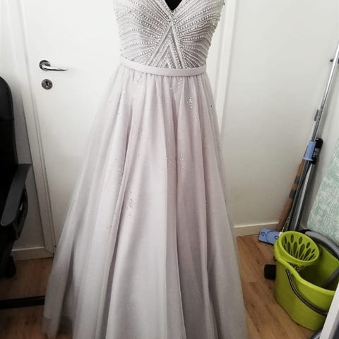 Kerran käytetty vihreän/mintun värinen vanhojentanssimekko. Yläosassa pitsi koristetta timanteilla, takana nyörit