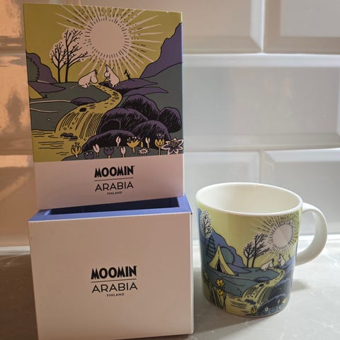 Muumimuki on uutta vastaavassa kunnossa, eli se on käyttämätön, tarra on paikallaan ja pahvilaatikko on tallella.