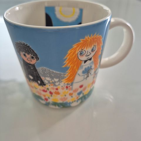 Muumimuki on uutta vastaavassa kunnossa, eli se on käyttämätön ja tarrat ovat paikallaan – tarroissa on kylläkin sen verran mainittavaa vikaa, että sisätarra repsottaa vähäisesti (kuvienmukaisesti), ja ulkotarra on ilmeisesti ottanut vähäistä jälkeä vitriinissä toisista mukeista, kun pölyjä on pyyhitty. 😅
