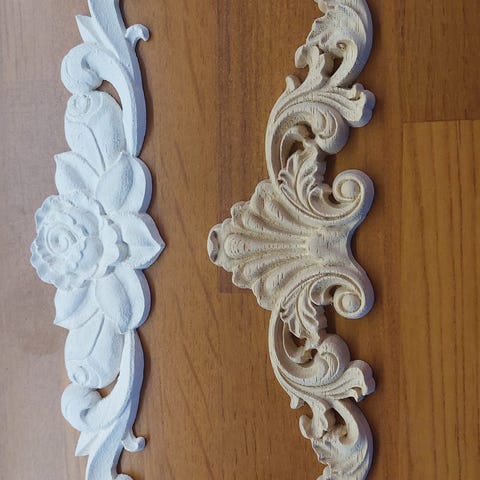 Koristeelliset rokokoo kulmakoristeet, valmistettu puusta ja maalattu valkoiseksi, sekä puunväriset rokokoo kukkakoristeet.