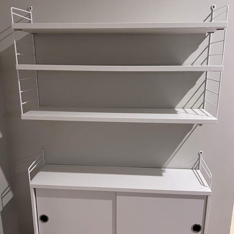 Myydään tyylikäs hyvässä kunnossa oleva hyllykokonaisuus. Ensimmäisessä kuvassa työpöydän kanssa. Toinen kuva otettu aikaisemmin.