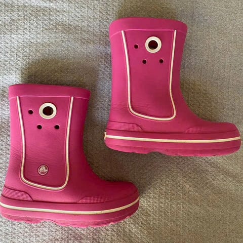 Crocsin siniset kumisaappaat. Koko J1, vastaa kokoa 32-33. Hyväkuntoiset ja ehjät. Ihan himmeää tummentumaa edessä jalkaterän kohdalla.