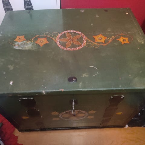 Myydään patinoitunut vihreän sävyinen arkku vuodelta 1946. Maali rapistunut kuten kuvista näkyy, mutta toimii hyvin säilytykseen.