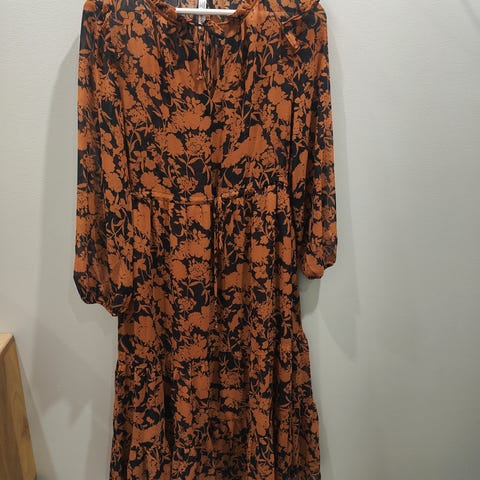 Mangon pitkän mallinen mekko, melko kapea malli. Koko XS. Kiristystä takana ja nyörit vaikka rusetille laitettavaksi edessä, ovat kiinni mekossa. Halkiot helmassa molemmin puolin.