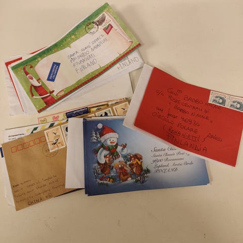 Ysärin aarteita. Postista aikoinaan ostettavissa olleet valmiit kirjeet joulupukilta. Mauri Kunnaksen kuvittamassa kirjekuoressa myös postimerkki ja Napapiirin postileima. Yhdessä kirjepohjassa repeämä, muut moitteetomassa kunnossa.