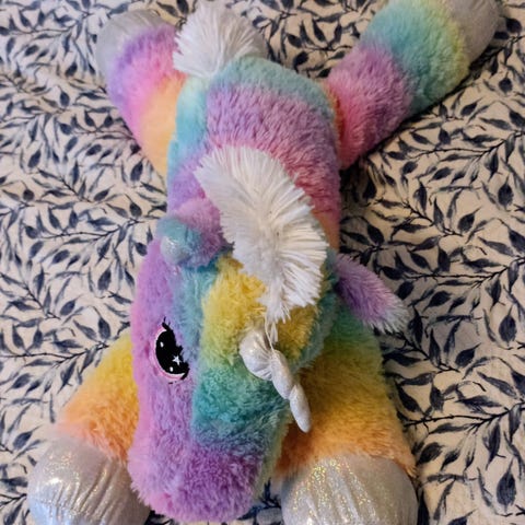 Iso pehmolelu yksisarvinen, juuri pesty pesukoneessa. Harja vähän takkuuntunut ja karhea mutta muutoin siisti