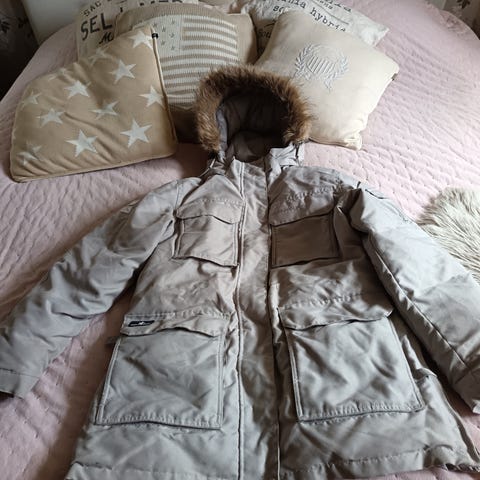 Ollut käytössä vain muutaman kerran, eli takki on todella hyvässä kunnossa. Takki on myös todella lämmin ja siinä on monta taskua.