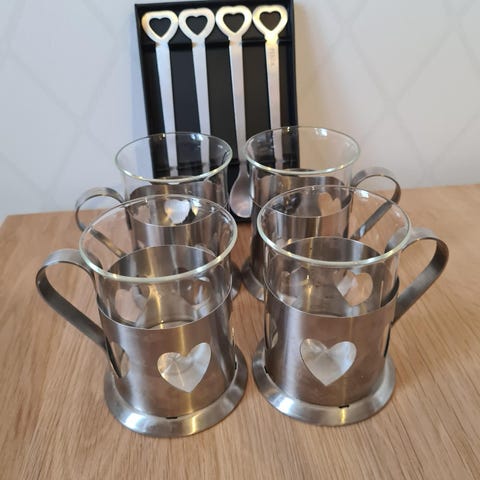 Muutaman kerran käytetyt Pentikin glögilasit/glögimukit. 6kpl sydänkuvioista ja 4kpl tähtikuvioista.