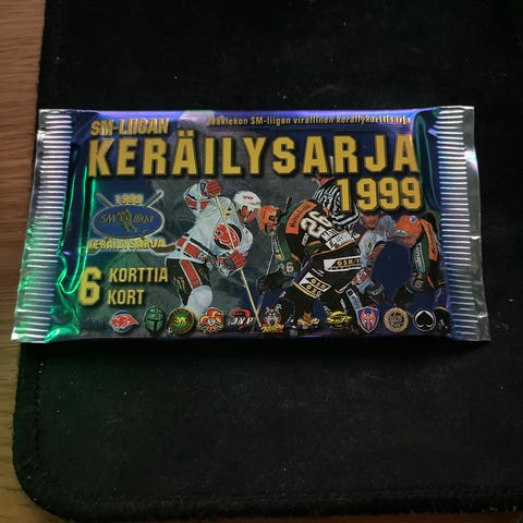 SM-Liiga keräilysarja 1999, avattu paketti ja kaikki kortit tossa. Sarja sopii keräilijöille ja jääkiekkoharrastajille.