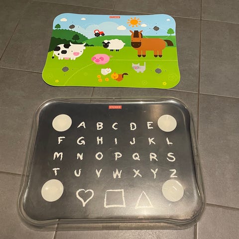 Neljällä eri kuviolla oleva Stokken pöytäänkiinnitettävä ruokailualusta.
