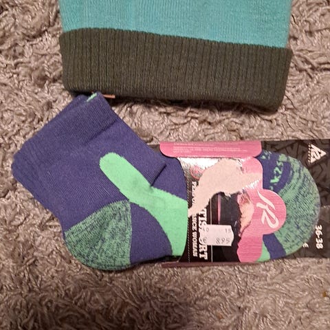 Kirjava myssy kokoa one size. Vuorelliset neulesormikkaat kokoa 7-9 vuotta ja vuorelliset neulelapaset kokoa XS. Sormikkaat ja lapaset samankokoiset.