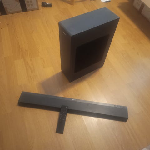 LG Wireless soundbarin active subwoofer. Virtajohto liimattu kiinteäksi kaijuttimeen.