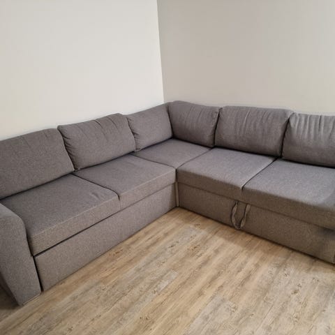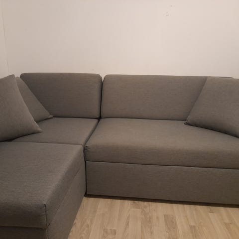 Vierashuoneesta pois melkein uusi kulmasohva vuoteella, hyvällä säilytystilalla petivaatteille