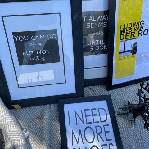 Kehystetty taulu, jossa esitetään sisustuselementtejä kuten tuoli, kasvi ja koriste-esineitä. Taulu on tarkoitettu seinäkoristeeksi, sopii erilaisiin sisustustyyleihin.