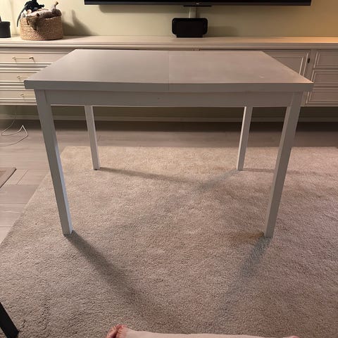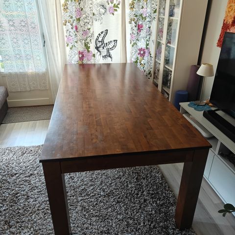 Tummanruskea puinen ruokapöytä. Kannessa muutamassa kohdassa pieniä naarmuja. Ostettu Iskusta v. 2009. Helppo lastata kuljetusvälineeseen. Tällä hetkellä kansi ja jalat irroitettu.