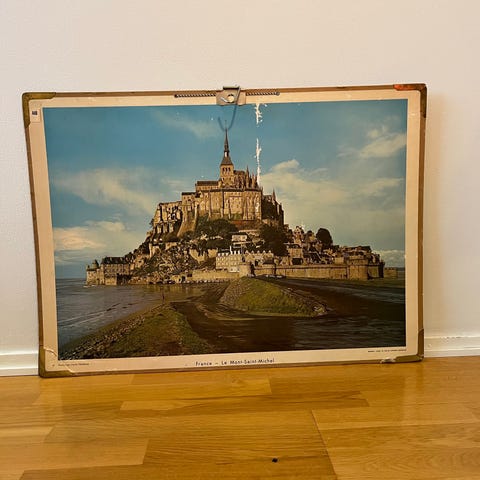 Reykjavik-kaupunkinäkymä -juliste / sisustustaulu. Takana on ripustusnaru ja koukku. Vanha, arviolta 60 tai 70 luvun. Kulmat messinkiä.