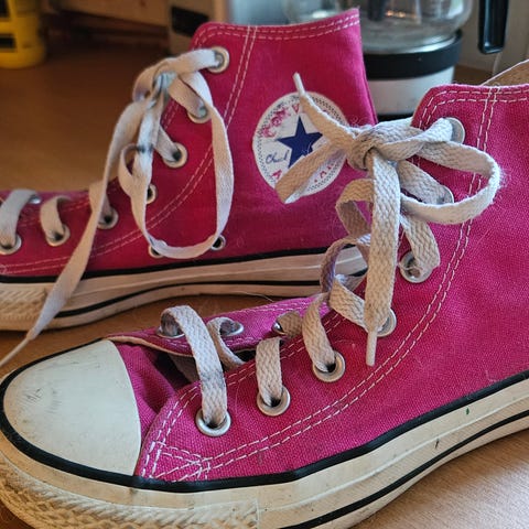 Tuunatut Converse Unisex lasten kengät, koko 37,5. Maalattu valkoiset kärjet ja Conversen logot - siksi kuntoluokitus kohtalainen. Muutoin ovat hyvässä kunnossa. Kengät ovat punaiset ja valmistettu kestävästä materiaalista. Malli on korkeavartinen, sopii lapsille ja tarjoaa tukea nilkalle.