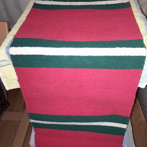 Vähän tummemman punainen kuin kuvassa. Ylä- ja alakappa sekä iso pöytäliina. Kaikki yhteensä 15€ + postikulut.