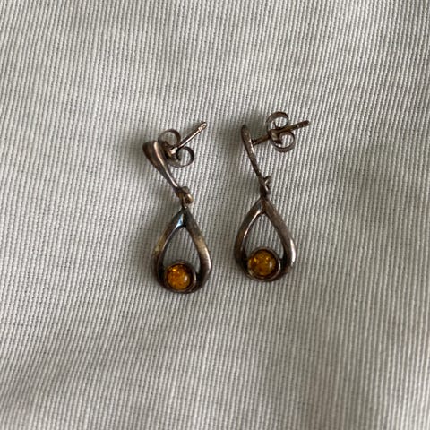 Kuvan mukaiset korvakorut, jossa meripihkakivi. Oletettavasti hopeaa, mutta en löytänyt leimoja. Nouto tai lähetys.