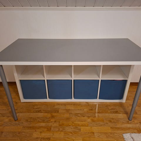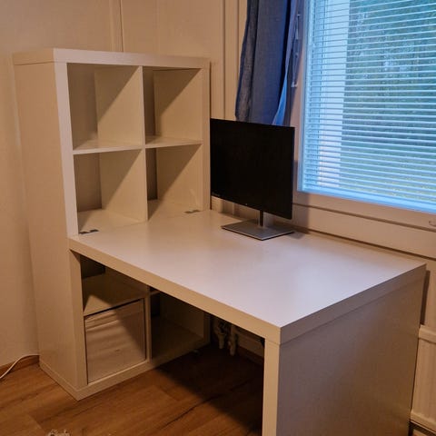 Valkoinen Ikea kallax hyllyyn sopiva pöytä. Vain pöytä ja kiinnikkeet. Jotain pieniä rikamia, jälkeä siellä täällä, en tiiä näkyykö kuvissa edes? Nopeimmalle noutajalle. En tiedä saako purettua osiin, huomio kuljetuksessa.