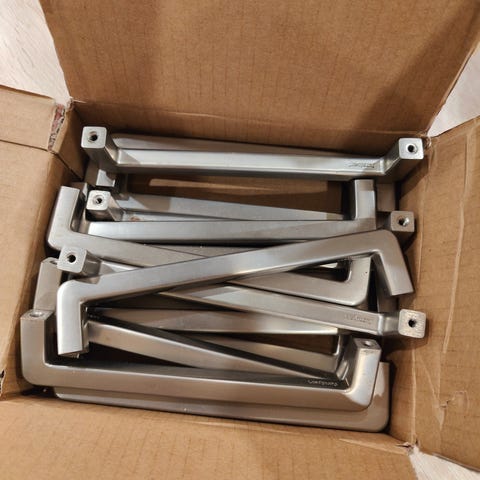 Siistit vetimet, 96mm jaolla. Näitä on 21 kpl. Merkki Pro Decor. Irroitettu ovista uusien alta pois, ruuvit löytyy kaikkiin. Muutaman ruuvin voi joutua uusimaan, avatessa ottivat osumaa kannasta.