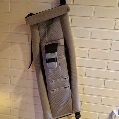 Laukun kiinnitys vaunuihin tarranauhoilla. Kantokahva on kätevä, jos laukku täytyy napata mukaan.