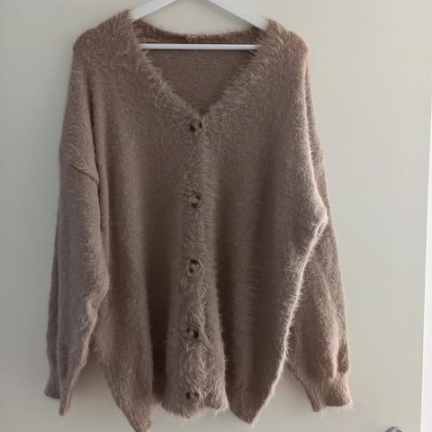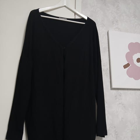 Uudenveroinen kiva neuletakki villasekoitetta. Kai-kai n 60 cm ja olka-helma n 86 cm. Taskut edessä. Ei kiinnitystä. Materiaali buklee -tyyppinen ja väri meleerattu ruoste. Materiaali joustaa reippaasti.
