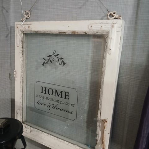 Kehystetty lasin alle valkoiseen, kevyesti kulutettuun puukehykseen. Ripustukseen kaunis satiinirusetti ja metallilanka – valmis suoraan seinälle.