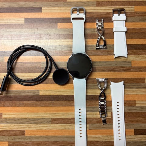 Myynnissä Samsung Galaxy Watch 6 44mm näytöllä ja hopeisena värinä.