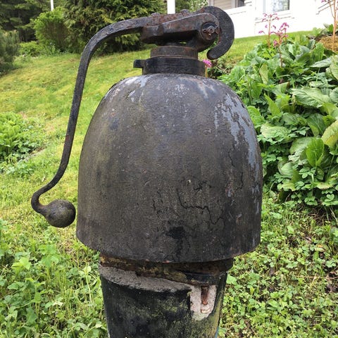 Junanlähettäjän kello Keski-Suomesta. Junanlähettäjä hoputti matkustajia nousemaan vaunuun kelloa soittamalla. Veturinkuljettaja sai lähtömerkin lipun heilautuksella. Postitus 5 euroa.