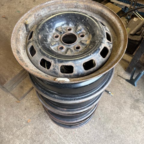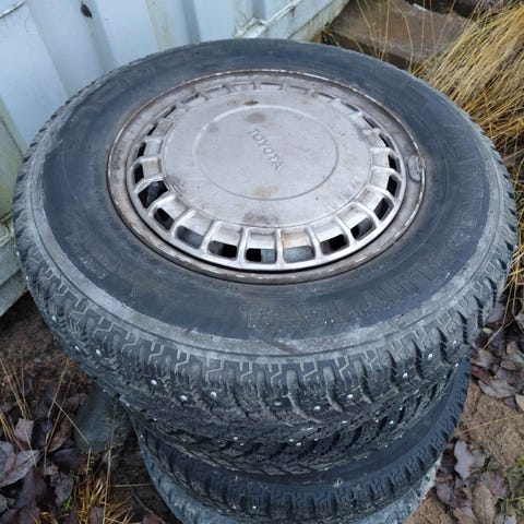 Kuvan ruosteiset peltivanteet -11 vuoden kitkarenkailla. Kahdessa vielä pintaa ja kaksi loppu.