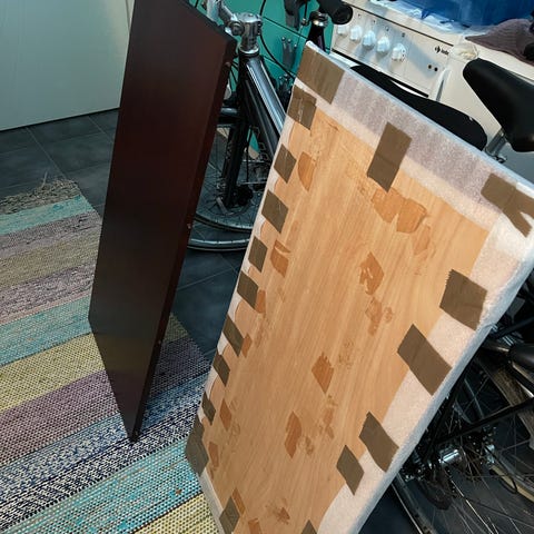 Itse tehty laadukkaalla mustalla pehmeällä vasikannahalla päällystetty puulevy, jossa kevyt pehmustus. Ollut meillä puulaatikon päälle ruuvattuna istuimena, joten alapuolella kahdet reiät reunoissa (kuva)