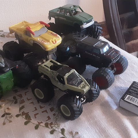 Pienet monsteriautot. Isomman korkeus n. 6cm, pienempien korkeus 3cm. Hinta kaikki yhteensä 1€. Vain nouto.