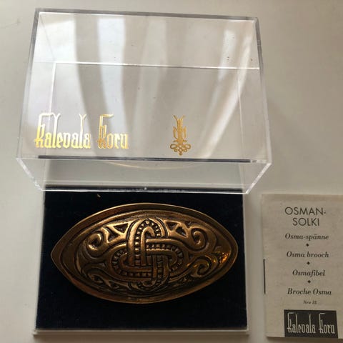 Kalevala kauluskoru, valmistettu pronssista. Kaksi korunosaa, jotka on yhdistetty ketjuilla. Korun halkaisija n. 3 cm, lyhin ketju 15 cm