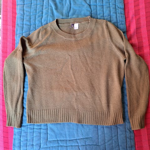 Part two luomu puuvillaa oleva neulepaita. Koko s. Reilu. Helmasta otettu merkki irti ja siihen jäänyt pieni vaalea läikkä. Muuten hyväkuntoinen