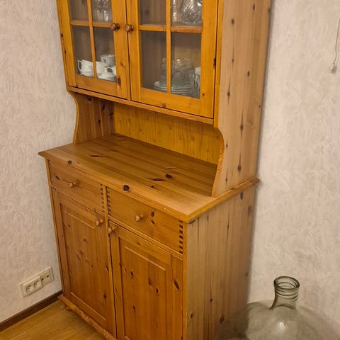 Kaappi on hyväkuntoinen, massiivista puuta, pinnassa ajan myötä syntynyttä pientä kulumaa, näkyy kuvissa.