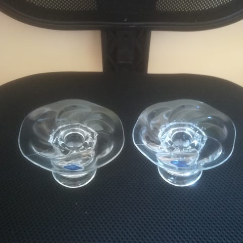 Iittala Lumme kirkas kynttilänjalka. Design, Kerttu Nurminen, Nuutajärvi. Korkeus 3 cm. Toisen halkaisija noin 6 cm ja toisen 7 cm