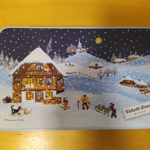 Sveisiläisen peltirasian kannessa on talvinen aihe, jossa näkyy myös enkeleitä. Rasian reunaa koristavat myös pienet enkelit. Rasian mitat ovat: korkeus n. 7 cm, pituus n. 22 cm ja leveys n. 14 cm.