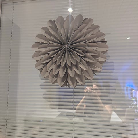Punainen paperitähti samettia, kultainen sisus. Pituus 70 cm. Tähden kärjet kuluneet.
