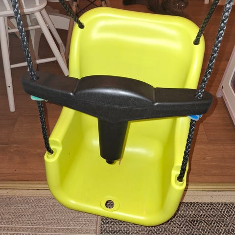 Käytetty pari kesää. Ehjä ja hyväkuntoinen. Keltainen osa hieman haalistunut ja likastunut. Korkea selkänoja sopii hyvin pienellekin vauvalle.