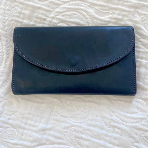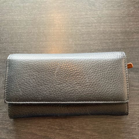 Myydään Marimekon nahkainen lompakko. Nahan pinnassa jonkin verran käytön jälkiä, yleiskunto siisti.