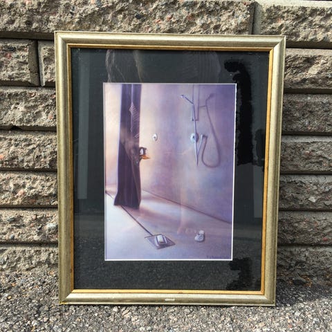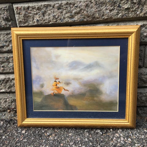 Kaj Stenvallin Aku Ankka -taulu ruskealla taustalla. Kullan väriset kehykset.