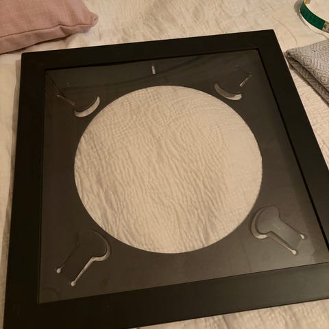 Muovinen seinään kiinnittyvä teline, jolla voi esitellä LP- levyjä. Voidaan valmistaa tarvittava määrä.